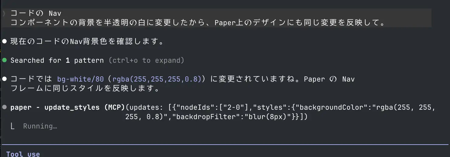 コードの Nav コンポーネントの背景を半透明の白に変更したから、Paper 上のデザインにも同じ変更を反映して。現在のコードの状態を確認したうえで、update_styles() ツールを使用して Nav コンポーネントの背景スタイルを更新してくれました。