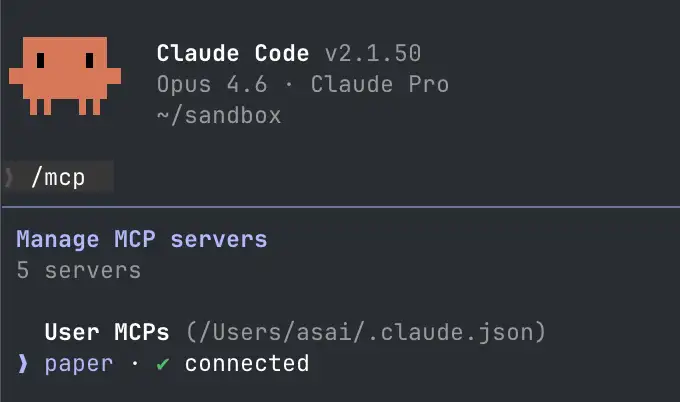 claude mcp add paper --transport http http://127.0.0.1:29979/mcp --scope userClaude Code を起動して /mcp コマンドを実行すると、Paper の MCP サーバーがリストに表示されているのがわかります。