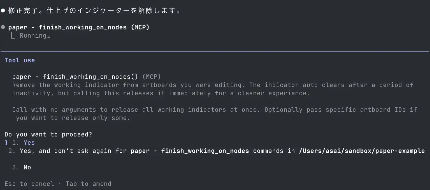 mode: "insert-children")MCP サーバーの実行中は Paper のキャンバス上で AI が編集中であることを示すインジケーターが表示されています。