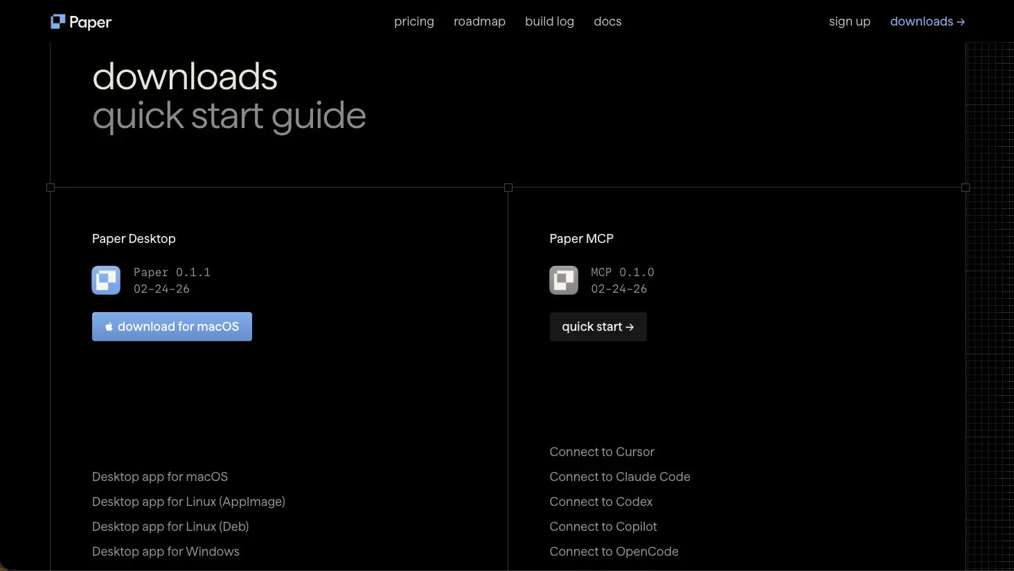 Paper にはブラウザ版とデスクトップ版があります。Paper と AI エージェントを接続するための MCP サーバーはデスクトップ版でのみ利用できるので、今回はデスクトップ版を使用しています。https://paper.design/downloads から OS に合ったバージョンをダウンロードしてインストールしてください。
