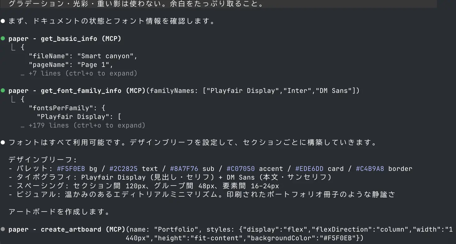 write_html() ツールを使用することで AI の学習データが豊富な HTML/CSS の知識を活用して、複雑なレイアウトやスタイルのデザインを生成したうえでノードとしてキャンバスに挿入できるという点が Paper のワークフローの大きな特徴の 1 つです。