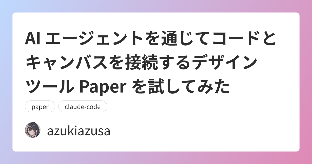Paper は AI エージェントを通じてコードとキャンバスを双方向に接続するデザインツールで、AI にデザインの作成やコードへの変換を任せることができます。Paper の MCP サーバーのツールを組み合わせることでキャンバス上のノードの情報を取得したり、デザインを挿入・編集したりすることができます。この記事では実際に Paper を試して、コードからデザインへ、デザインからコードへの双方向のワークフローがどのように実現されているのかを紹介します。