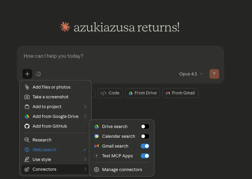 Claude に戻り、新しいチャットを開始します。追加した Connector のトグルスイッチがオンになっていることを確認してください。