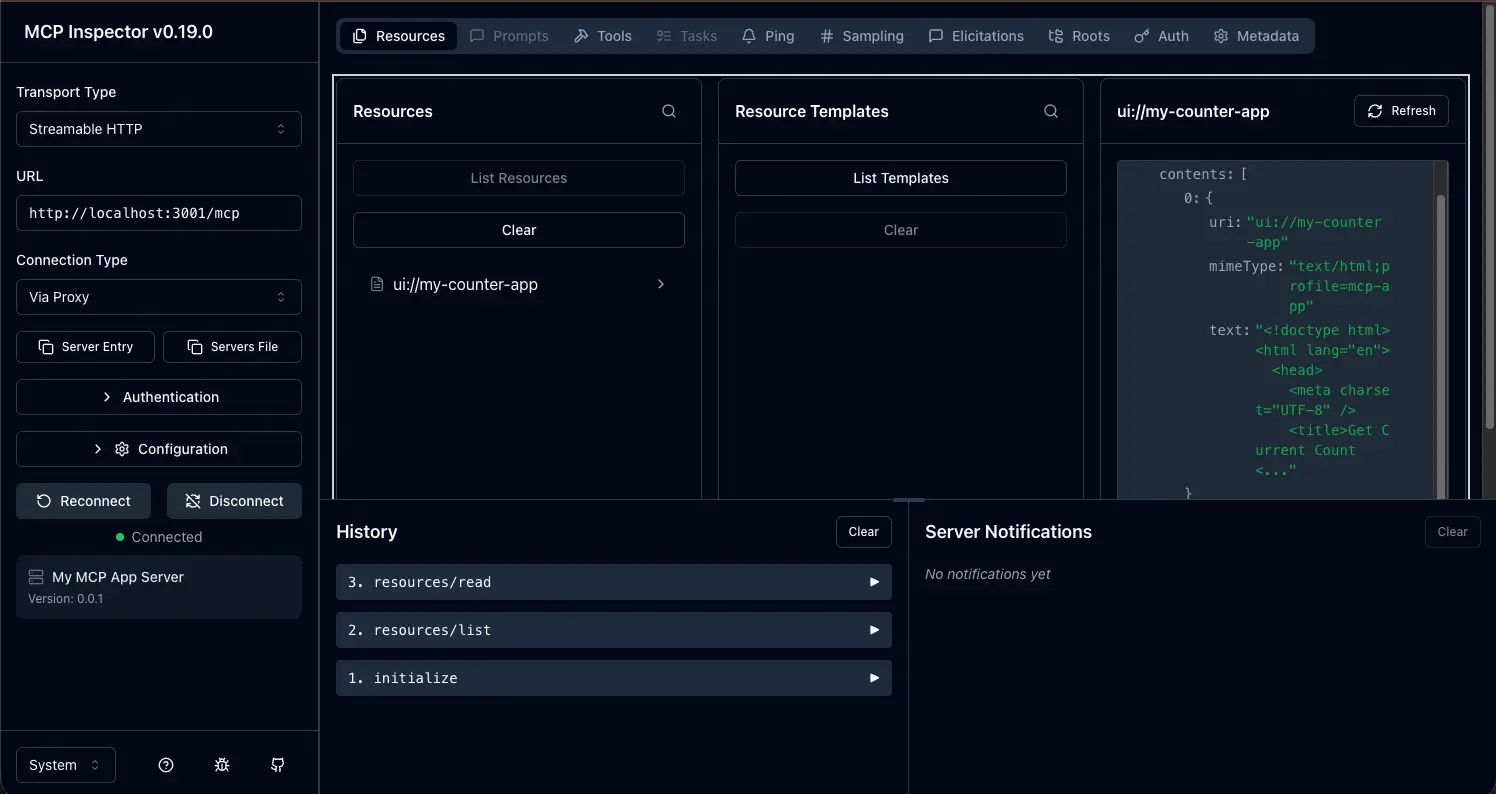 サーバーに接続できたら「Resources」タブを確認してみましょう。「List Resource」→「ui://my-counter-app」を選択するとビルドされた HTML がリソースとして登録されていることが確認できます。