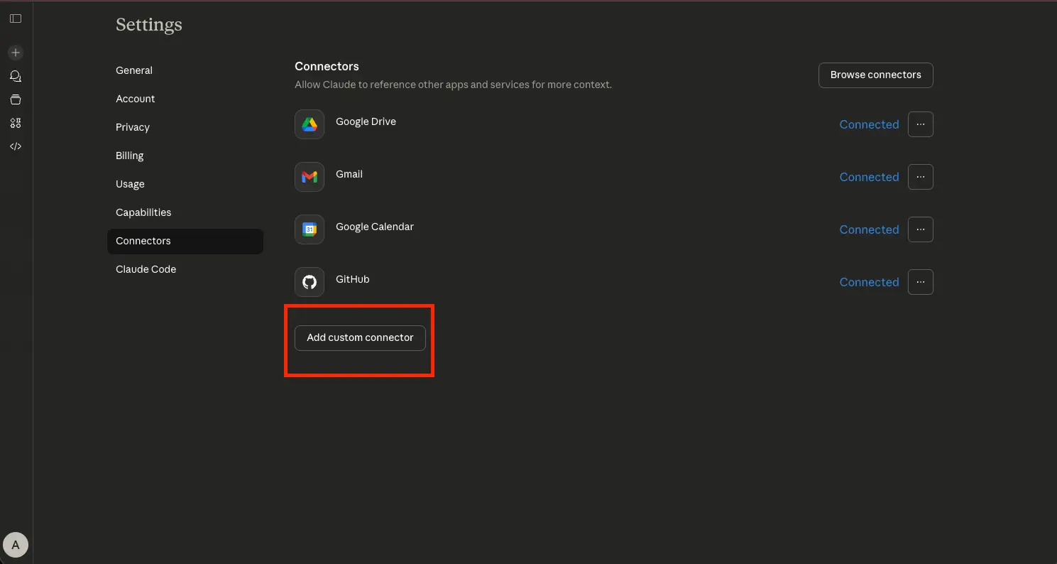 npx cloudflared tunnel --url http://localhost:3001Claude の Connectors 画面を開き、「Add Custom Connector」ボタンをクリックします。