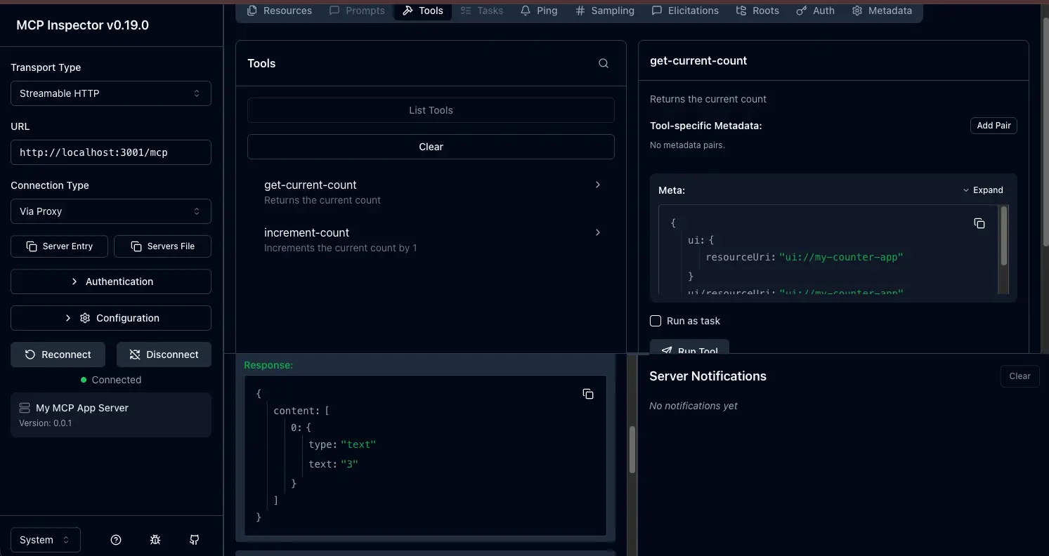 次に「Tools」タブを確認してみましょう。「List Tool」→「get-current-count」を選択すると、ツールのメタ情報に UI コンポーネントのリソース URI が指定されていることが確認できます。ツールが正しく呼び出されるかどうかも確認しておきましょう。increment-count ツールを呼び出すたびに get-current-count ツールの結果が更新されることが確認できます。