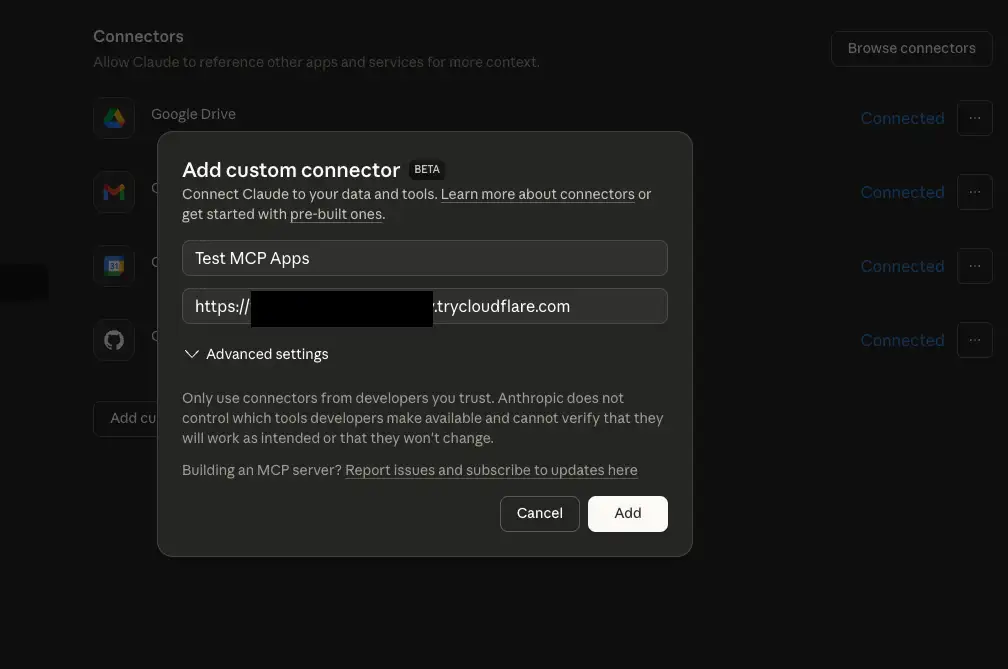 表示されたダイアログで「MCP Server URL」に https://<your-subdomain>.trycloudflare.com/mcp のように cloudflared で公開した URL を指定し、「Add」ボタンをクリックします。