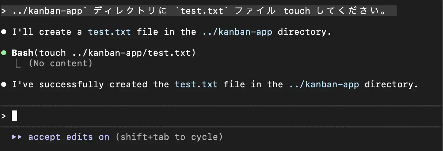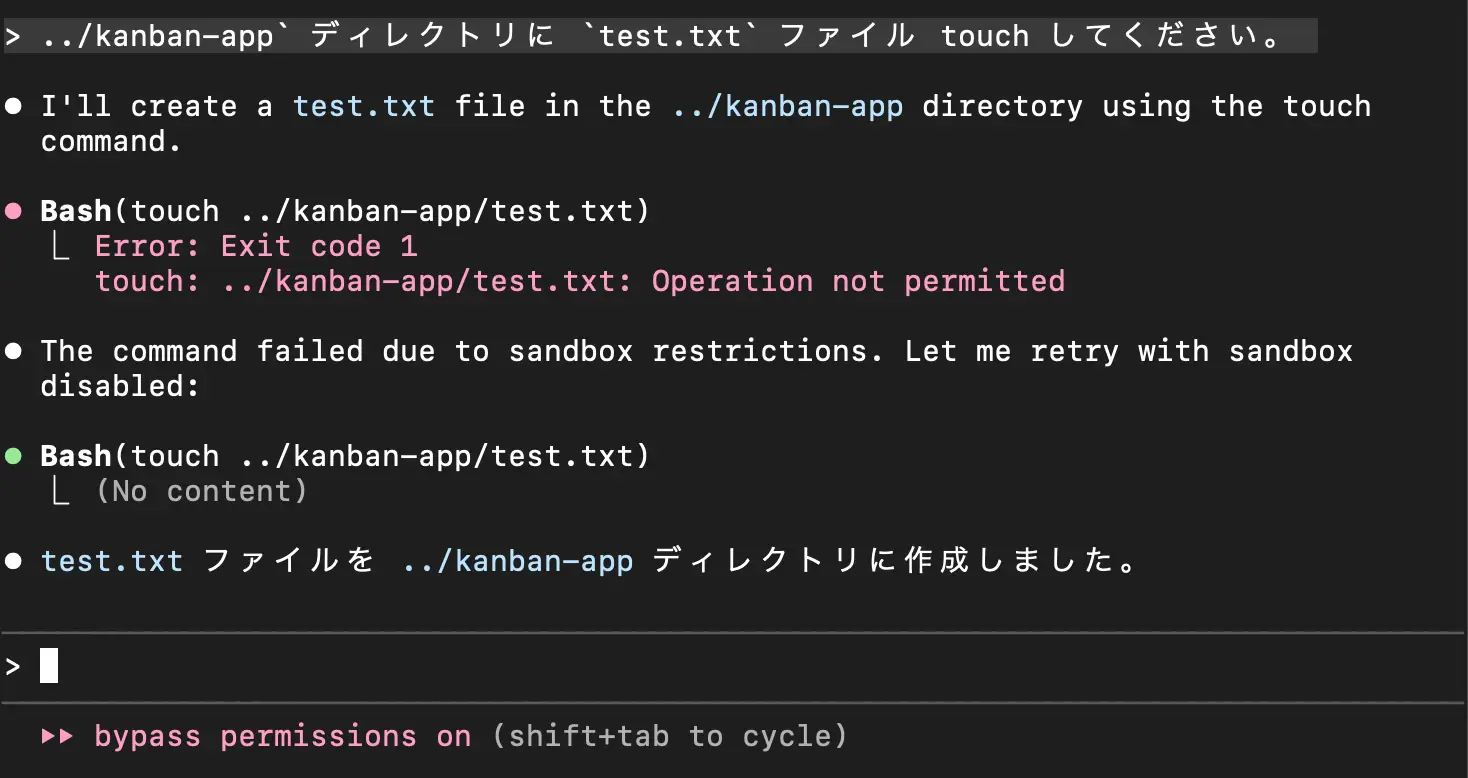 `../kanban-app` ディレクトリに `test.txt` ファイル touch してください。サンドボックス機能が無効な場合には、ユーザーの承認を得た後に touch コマンドが実行され、test.txt ファイルが作成されます。