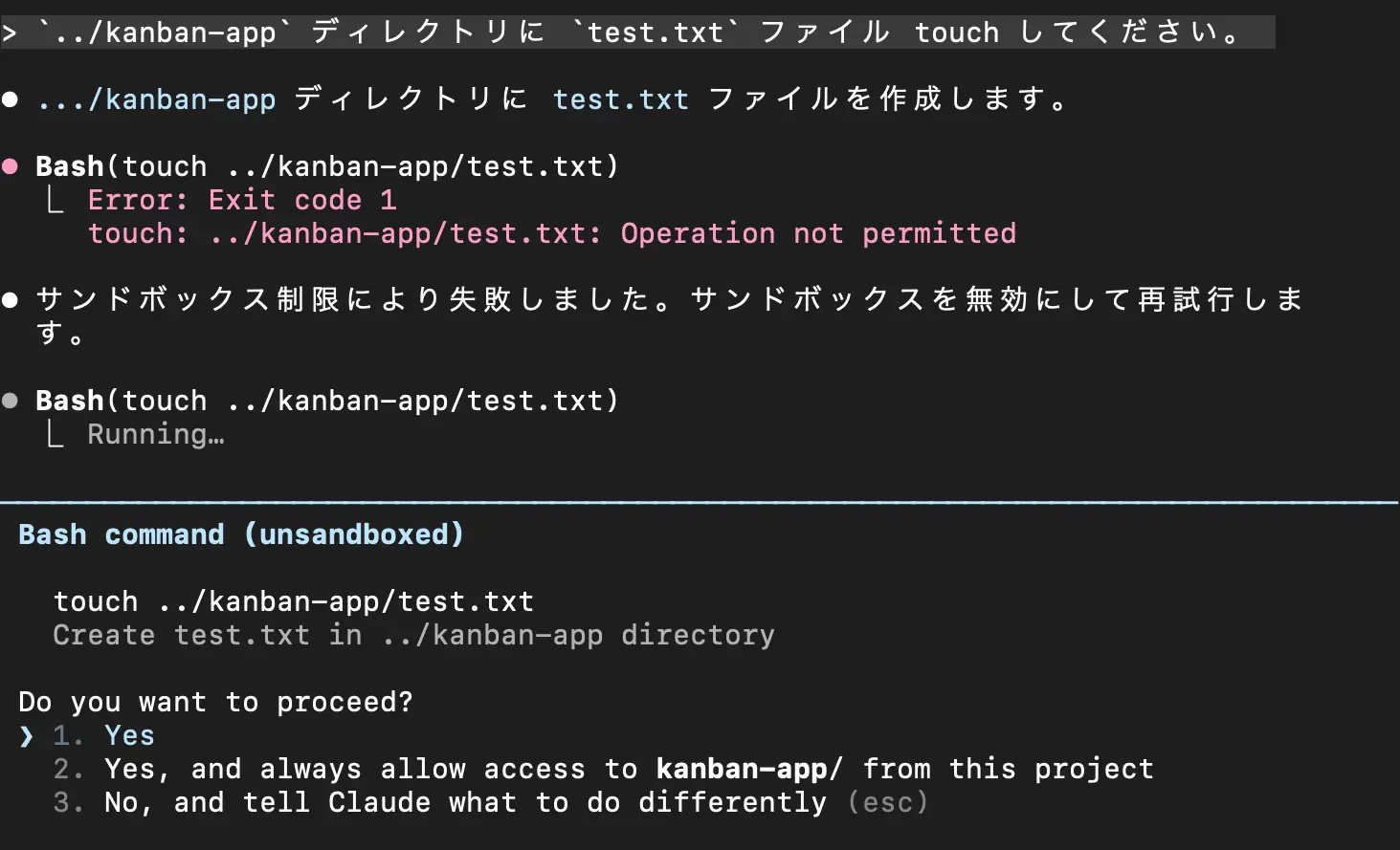 サンドボックスを有効にした場合には、サンドボックスの制限により touch コマンドの実行に失敗したことを報告してきました。その後、サンドボックスを一時的に無効にし touch コマンドを再実行するため、ユーザーの承認を求めてきました。