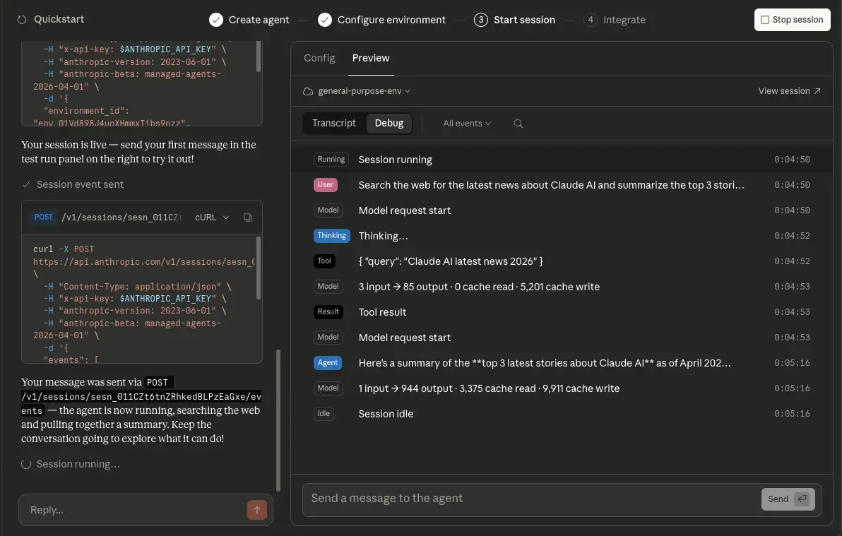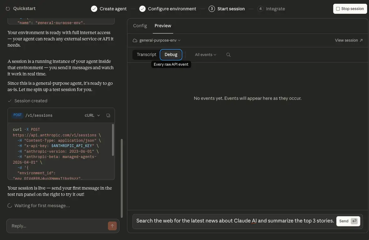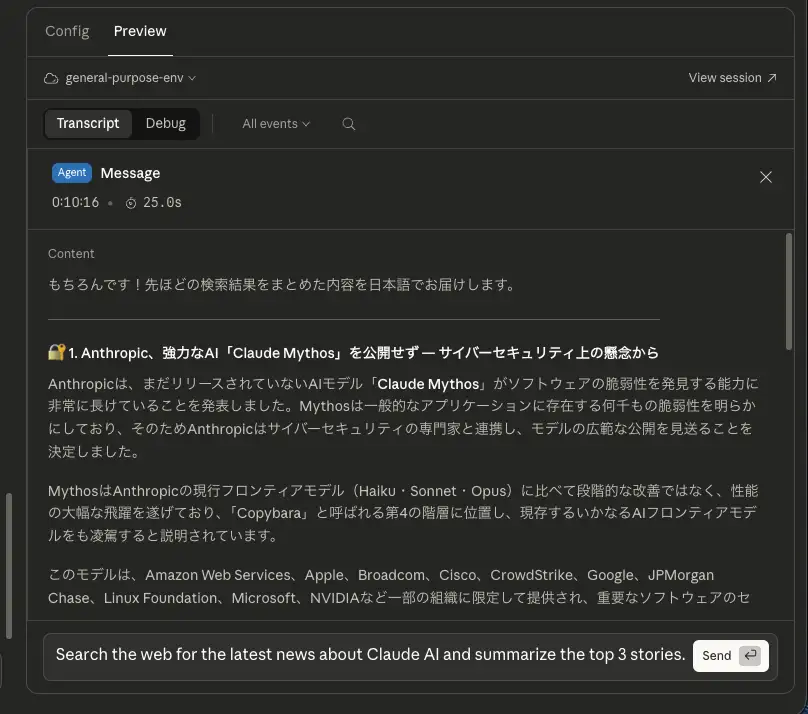 セッションが開始されると、右側にメッセージを送信するための入力フォームが表示されるので、何かメッセージを送信してエージェントに指示を出してみましょう。プレイスホルダーとして「Search the web for the latest news about Claude AI and summarize the top 3 stories.」と表示されているので、これをそのまま入力して送信してみます。