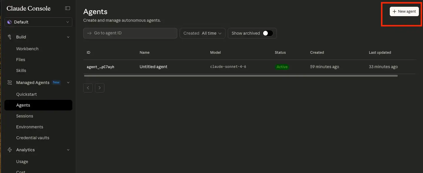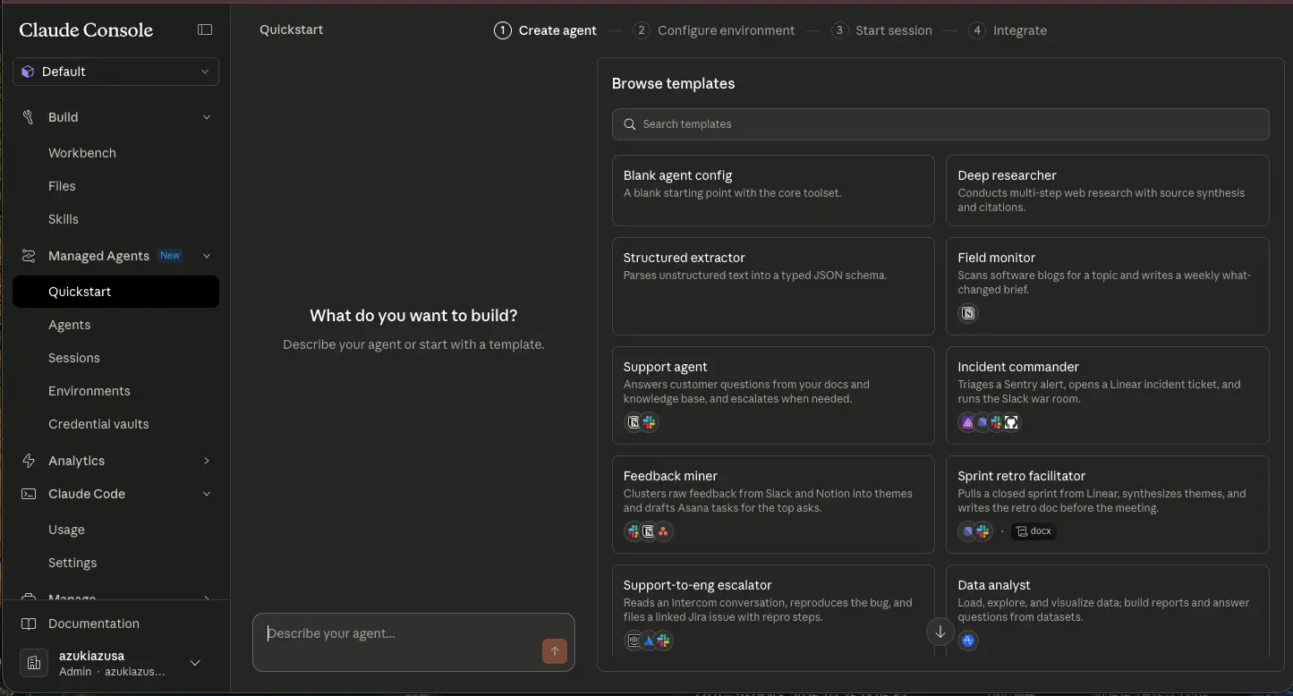 まずは Claude Managed Agents の基本的な操作感をつかむために、Claude Console 上でエージェントの作成からセッションの開始までを順番に試してみます。