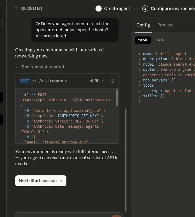 ネットワークアクセスを許可する形でエージェントの質問に返答すると、/v1/environments エンドポイントに POST リクエストが送られて環境が作成されます。環境が作成されたら「Next: Start session」をクリックしてセッションを開始しましょう。
