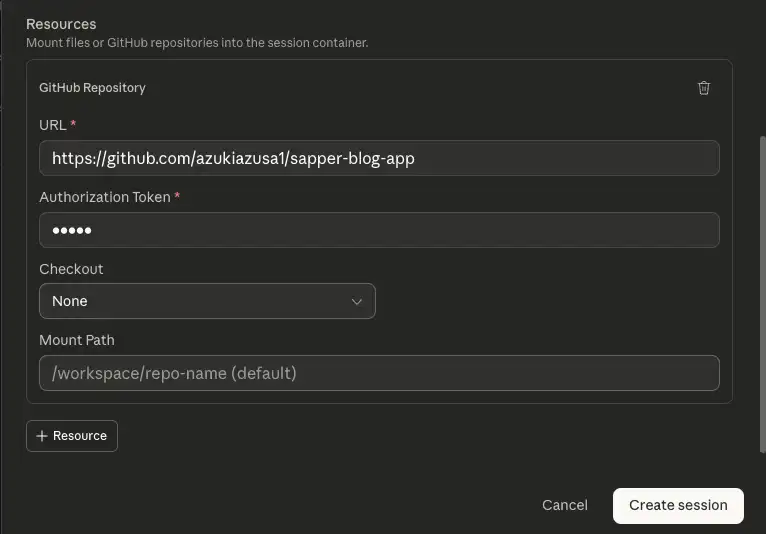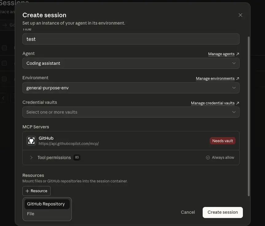次にセッションを作成します。セッションを開始する際にオプションでリソースを指定できます。リソースには「GitHub repository」や「File」などがあり、セッション開始時にエージェントがアクセスできるリソースを指定できます。ここで指定する GitHub repository リソースは、先ほど Vault に保存した GitHub MCP サーバーの認証とは別に、リポジトリをクローンするための認証情報を受け取ります。エージェントには先程作成した「Coding assistant」エージェントを指定し、リソースには「GitHub repository」を選択します。