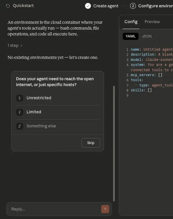 エージェントと対話形式で環境の設定が進められていきます。質問では環境がオープンなインターネットにアクセスできるか、それとも特定のホストのみにアクセスできるようにするかが聞かれました。