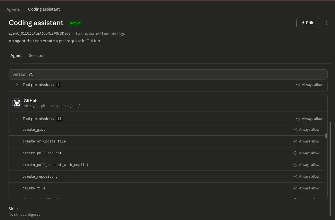 type: always_allow作成後のエージェントを確認すると、GitHub MCP サーバーがツールとして定義されていて create_pull_request などの操作が使用可能になっていることを確認できます。