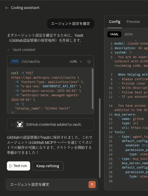- Vault を使用して認証情報をあらかじめ保管しておくことで、GitHub MCP サーバーなどの外部サービスにアクセスするための認証情報をエージェントが利用できるようになる