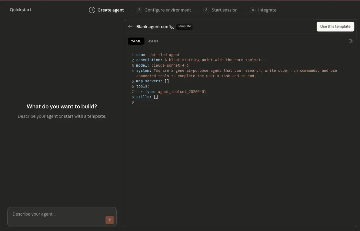 ここでは Blank agent テンプレートを選択して、汎用的なエージェントを作成してみましょう。YAML もしくは JSON の設定画面が表示されるので、内容を確認して「Use this template」をクリックします。これでエージェントが作成されます。