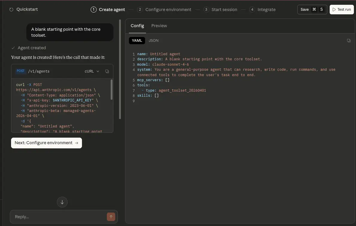Claude Managed Agents は Claude Console もしくは SDK を使用して API 経由で利用できます。/v1/agents エンドポイントでエージェントを作成し、/v1/sessions エンドポイントでセッションを開始するといった形です。Claude Console を使用する場合、エージェントの作成からセッションの開始までの一連の流れを UI 上で対話形式で進めることができます。
