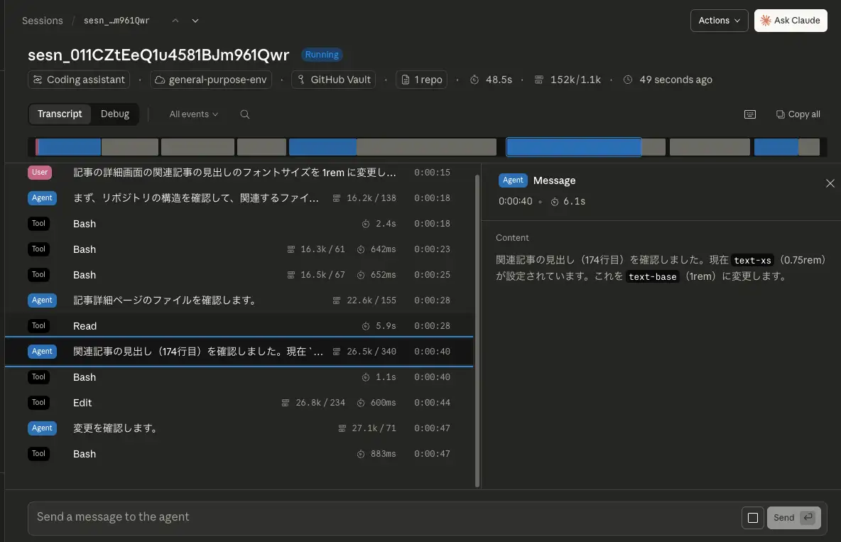 セッションを作成したらエージェントに指示を出してみましょう。ここでは試しに「記事の詳細画面の関連記事の見出しのフォントサイズを 1rem に変更し、その変更をプルリクエストとして作成して」という指示を出してみます。