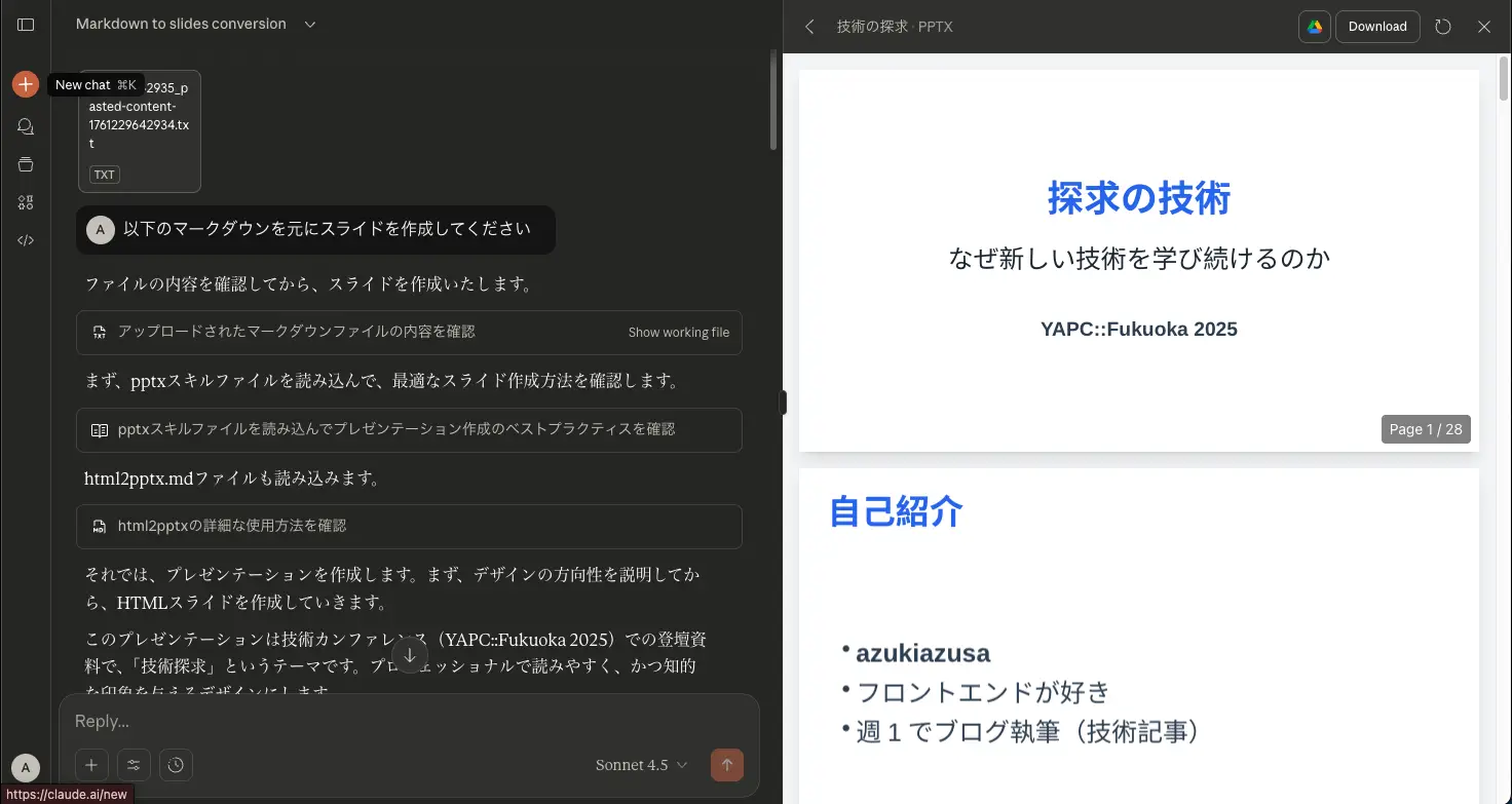 Claude ではスプレッドシートやスライドを作成するためにスキルと呼ばれる機能を利用します。例えば「以下のマークダウンを元にスライドを作成してください」という指示を与えると、pptx スキル・html2pptx.md ファイルを読み込みスライドの作成方法を確認したうえで、アーティファクトとして pptx ファイルを生成します。
