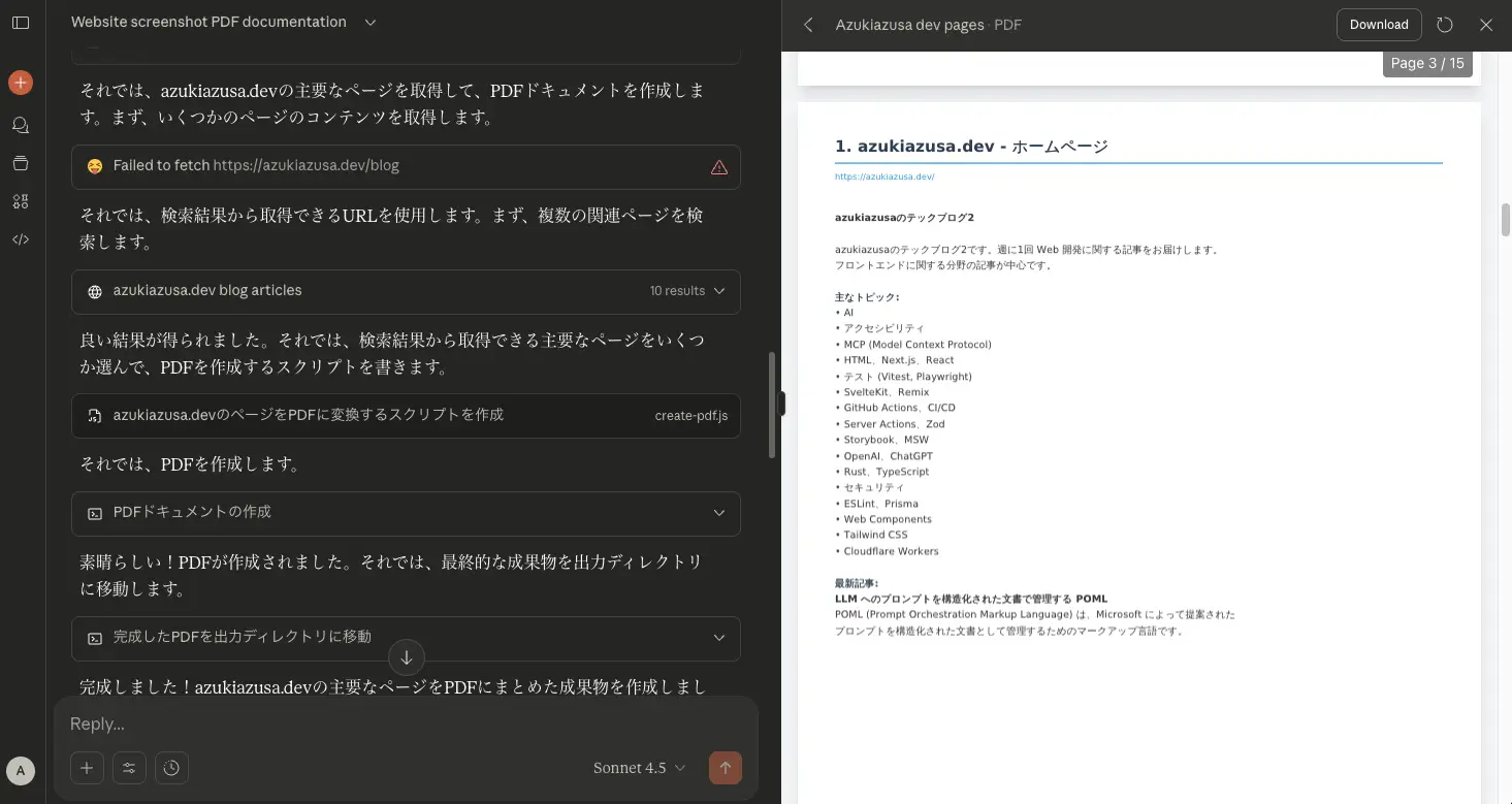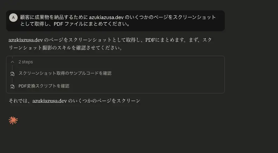 顧客に成果物を納品するために azukiazusa.dev のいくつかのページをスクリーンショットとして取得し、PDF ファイルにまとめてください。スキルの使用方法を確認し、さらにスクリプトの example や scripts を追加で読み込んでいることが確認できます。