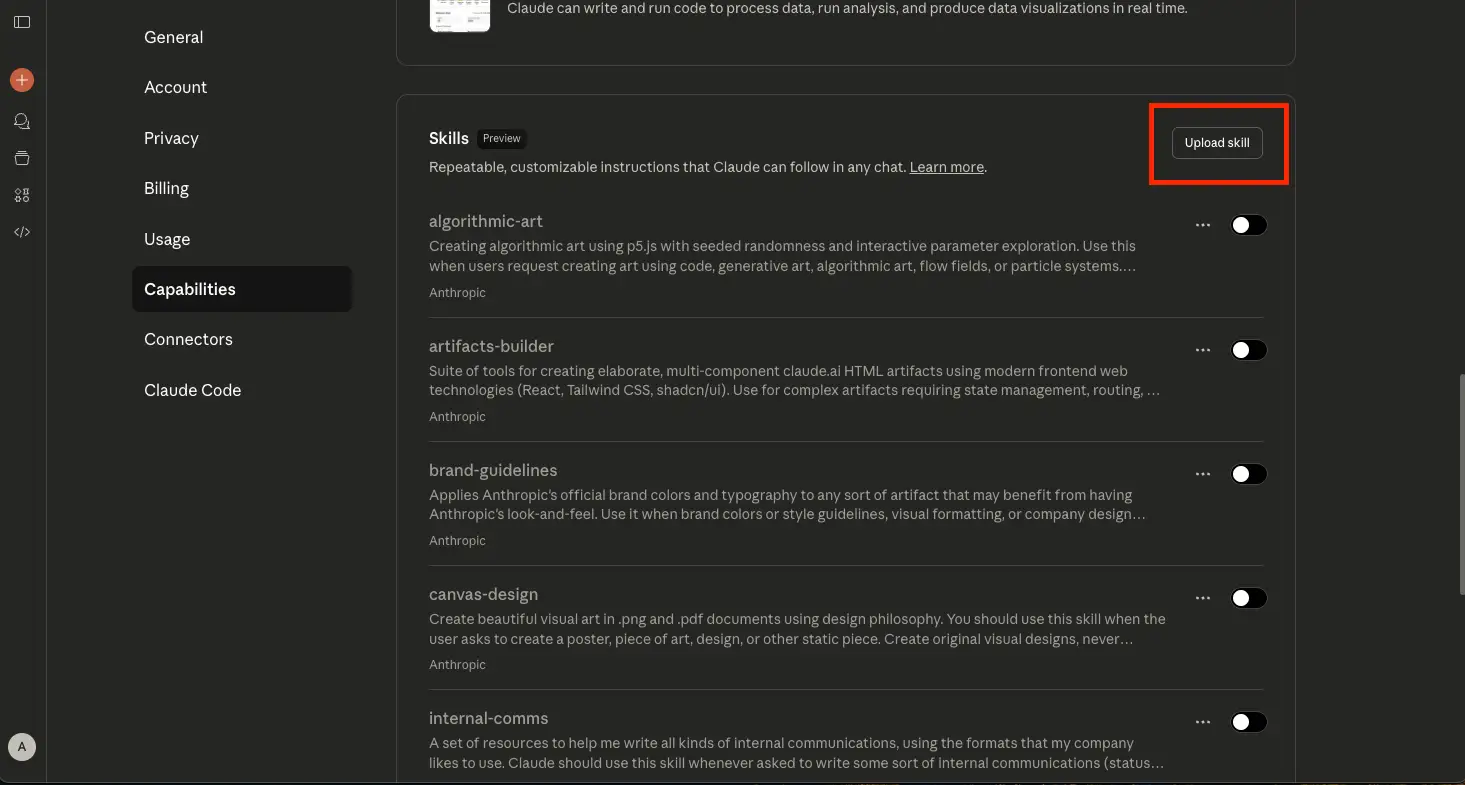 Claude アプリでスキルを利用する場合は Pro, Max, Team, Enterprise プランのいずれかに加入している必要があります。Claude アプリの設定画面を開き、「Skills」セクションで「Upload Skill」ボタンをクリックします。