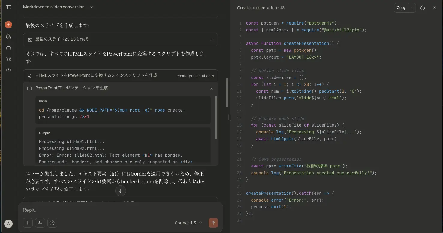 このスキルではスライドの元になる HTML ファイルを作成し、PptxGenJS ライブラリを使用して pptx ファイルを生成する JavaScript コードをサンドボックス内で実行している様子が確認できます。