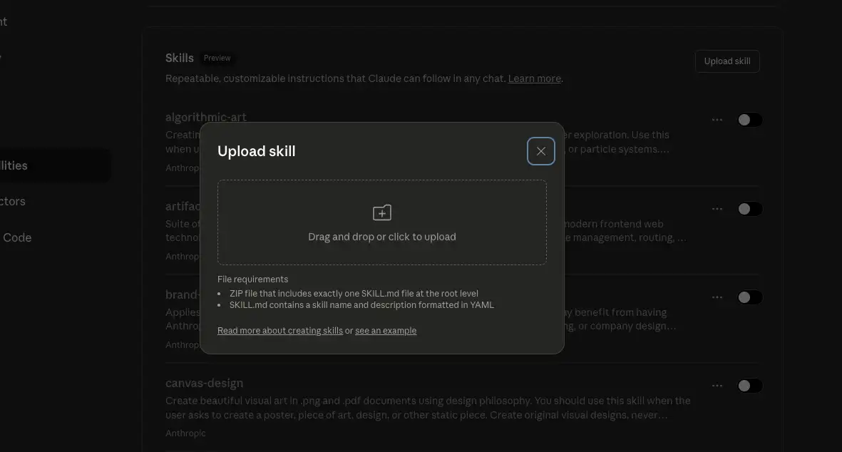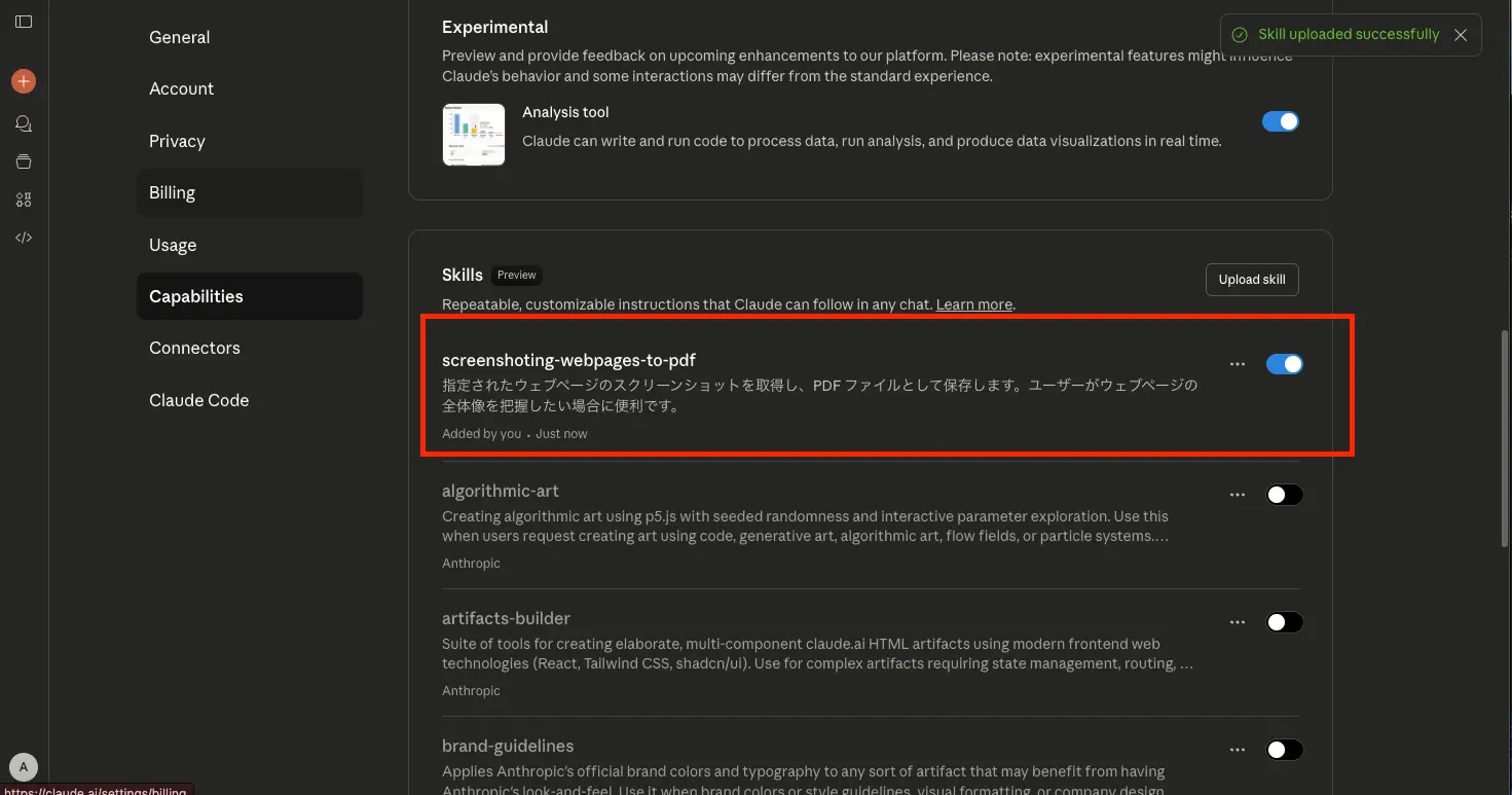 Skills の一覧にアップロードしたスキルが追加されていることが確認できます。トグルスイッチがオンになっている場合はスキルが有効化されている状態です。