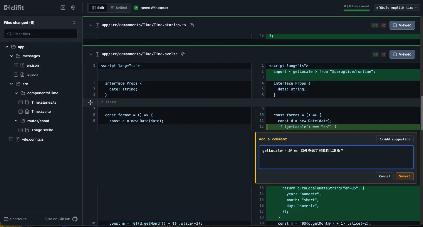 npx difit @ mainコマンドを実行すると http://localhost:4966 で差分を確認できるようになります。行単位でコメントを残し、プロンプトとしてエージェントにフィードバックできます。