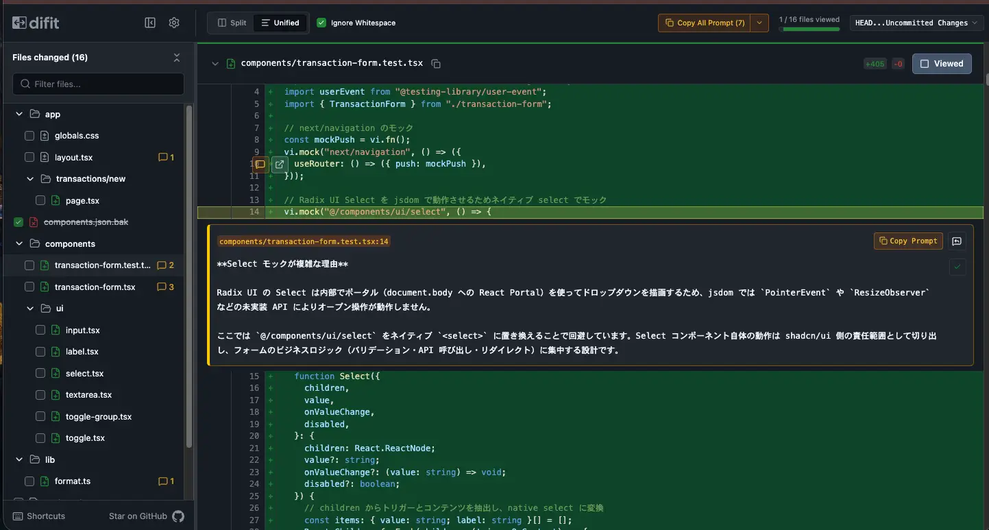 /difit-reviewここではなぜ <Select> コンポーネントをテストでモックしているのか、コードを見ただけでは分かりづらい変更点についてエージェントがコメントを残しています。例えば「テスト環境では複雑な UI コンポーネントの内部実装よりもフォームの振る舞いを検証したいため、<Select> を単純なモックに置き換えている」といった補足があれば、差分の意図をすばやく把握できます。