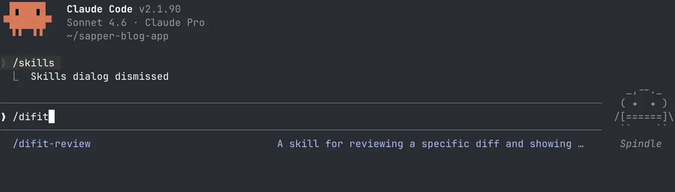 スキルのインストールが完了したら、エージェントから difit-review スキルを使用できるようになっているか確認してみましょう。例えば Claude Code では /difit-review と入力したときに候補として表示されれば、スキルが正しく認識されています。