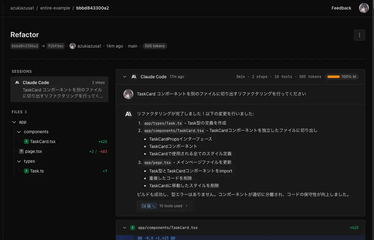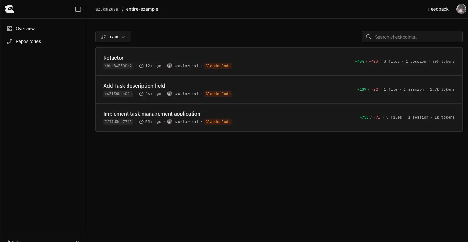 entire/checkpoints/v1ブランチに保存され、セッションのコンテキストやトークン使用状況などを確認できる entire explainコマンドを使用してチェックポイントの詳細を確認できる- entire.io のダッシュボードで AI エージェントのセッションをより優れた UI で確認できる。ダッシュボードではユーザーのプロンプトや AI エージェントの応答、ツールの使用履歴、AI がコードを書いた割合などを確認できる