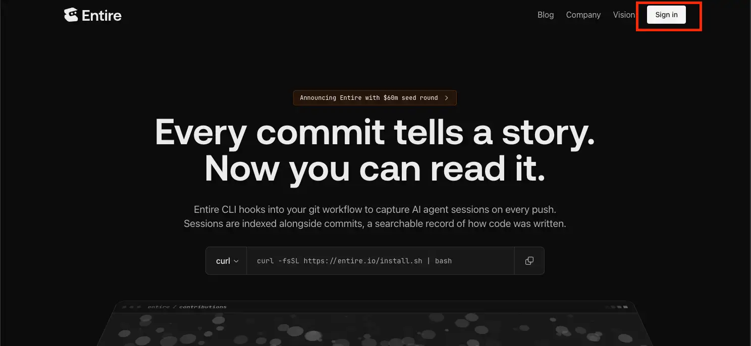 entire.io のダッシュボードでは、AI エージェントのセッションをより優れた UI で確認できます。はじめに「Sign in」ボタンをクリックして GitHub アカウントでサインインします。