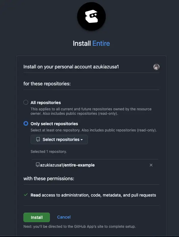サインイン後 GitHub App Entire をインストールするように求められるため、レポジトリを選択してインストールします。