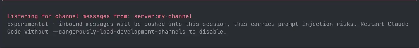 claude --dangerously-load-development-channels server:my-channelMCP サーバーが正しく認識されていれば、Claude Code の起動時に「Listening for channel messages from: server:my-channel」というメッセージが表示されます。