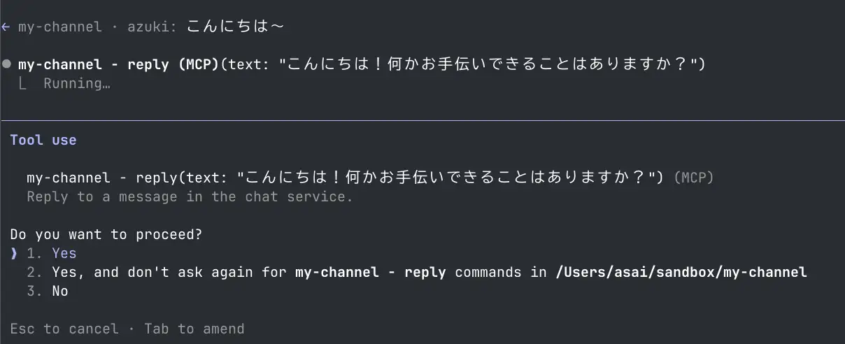 curl -X POST http://localhost:3000/send -H "Content-Type: application/json" -d '{"name": "azuki", "message": "こんにちは〜"}'azuki というユーザーから「こんにちは〜」というメッセージが受信されて Claude Code のセッションに表示されていることが確認できます。Claude Code は reply ツールを使用してチャットサービスに返信を行おうとしていますね。