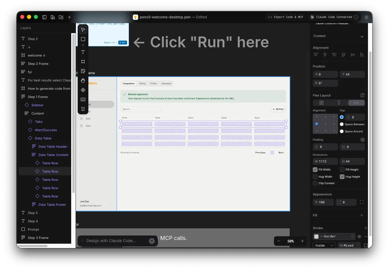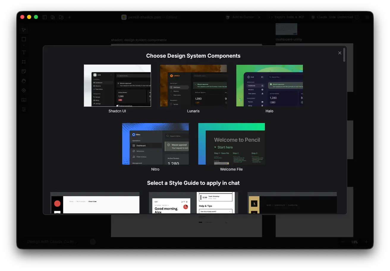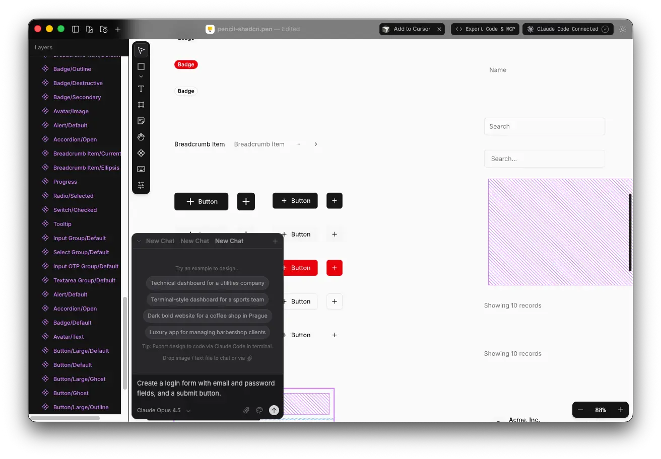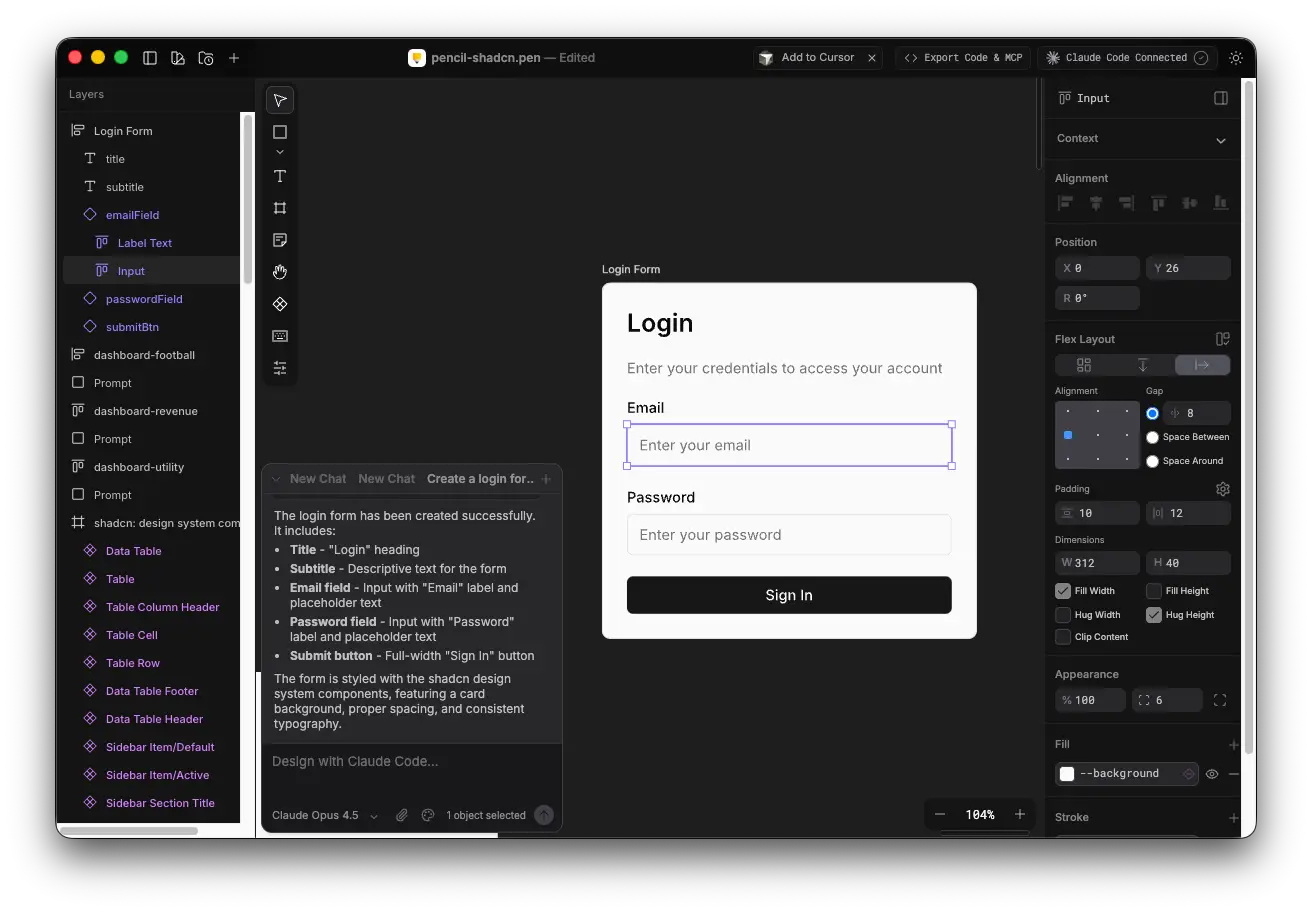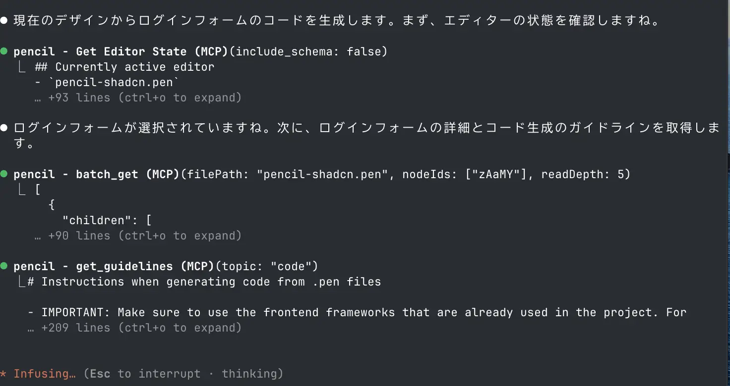 - Pencil MCP を使用して Claude Code と連携し、デザインからコードを書き出すことが可能。Pencil 上で選択中のノードを解析し、Shadcn UI のコンポーネントを使用してコードを書き出すことができた