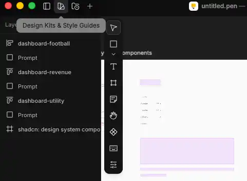 AI を使用してデザインを生成する方法を試してみましょう。まずは新しい .pen ファイルを作成します。空のファイルで作成しても良いのですが、ここではあらかじめ用意されたデザインシステムコンポーネントを使用してみましょう。上部のツールバーの左から 2 番目のアイコンの「Design Kits & Style Guides」をクリックします。