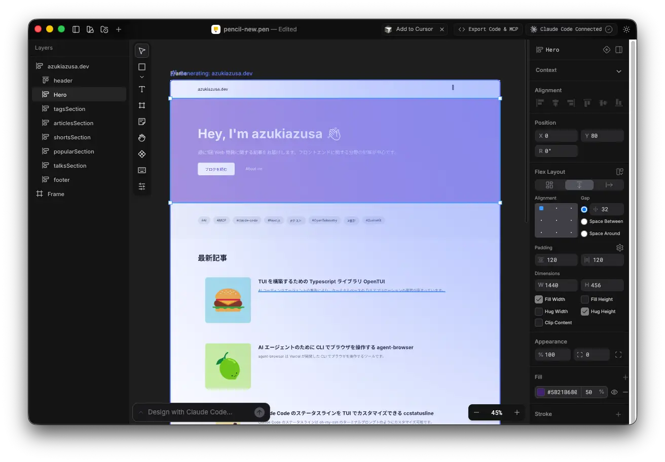 claude "Playwright MCP を使用して、azukiazusa.dev のデザインを取得し、Pencil 上にデザインをインポートしてください。"Playwright MCP の take_screenshot ツールが呼び出され、指定されたウェブサイトのスクリーンショットが取得されます。その後 batch_design ツールで現在開いている Pencil のキャンバスにデザインが作成されます。作成されたデザインの再現度はあまり高くありませんが、ターミナルから様々なツールを組み合わせて利用できる点は面白いですね。