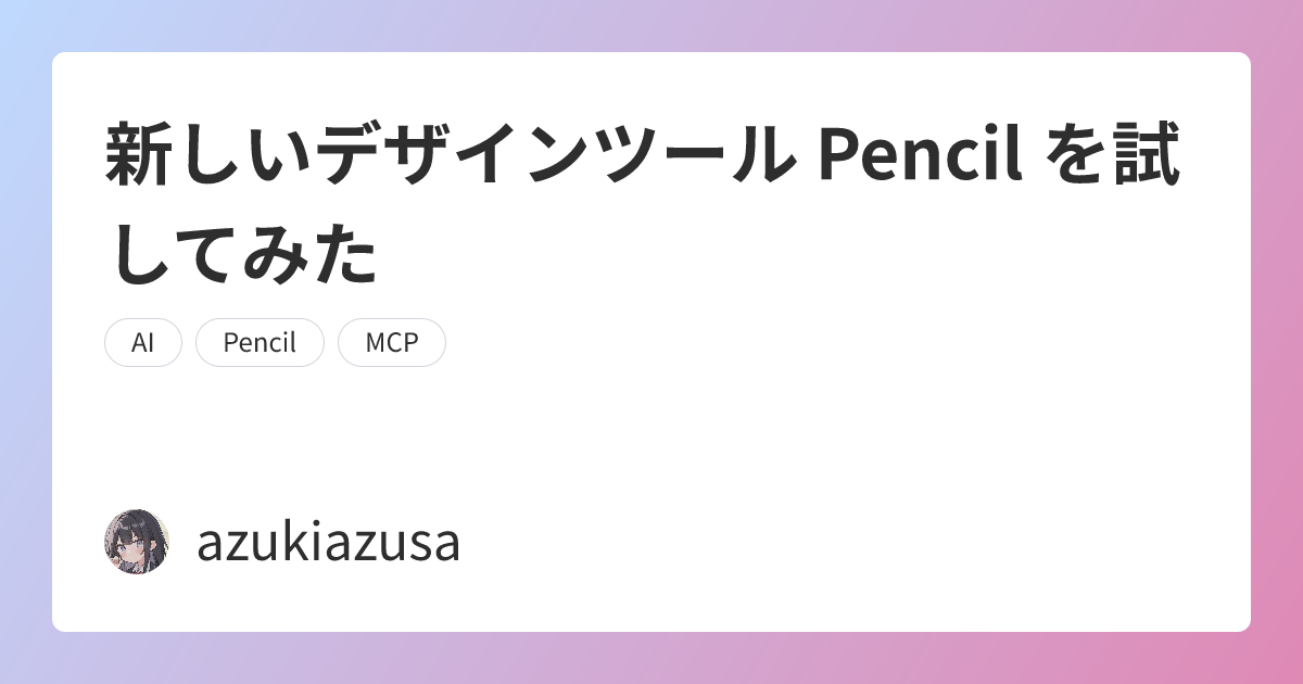 claude "Playwright MCP を使用して、azukiazusa.dev のデザインを取得し、Pencil 上にデザインをインポートしてください。"Playwright MCP の take_screenshot ツールが呼び出され、指定されたウェブサイトのスクリーンショットが取得されます。その後 batch_design ツールで現在開いている Pencil のキャンバスにデザインが作成されます。作成されたデザインの再現度はあまり高くありませんが、ターミナルから様々なツールを組み合わせて利用できる点は面白いですね。