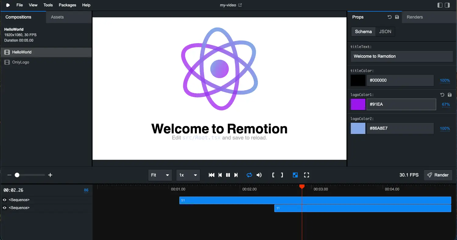 };順を追って見ていきましょう。React コンポーネントの Props の定義には Zod を使用しています。myCompSchema で Props のスキーマを定義し、HelloWorld コンポーネントの型引数として z.infer<typeof myCompSchema> を指定しています。TypeScript の Type ではなく Zod のスキーマを使うことで、Remotion Studio 上で Props を視覚的に編集できるようになるという利点があります。ここで定義した myCompSchema は src/Root.tsx の <Composition> コンポーネントに渡されています。これにより、Remotion Studio 上で titleText や titleColor、logoColor1、logoColor2 の値を編集できるようになります。