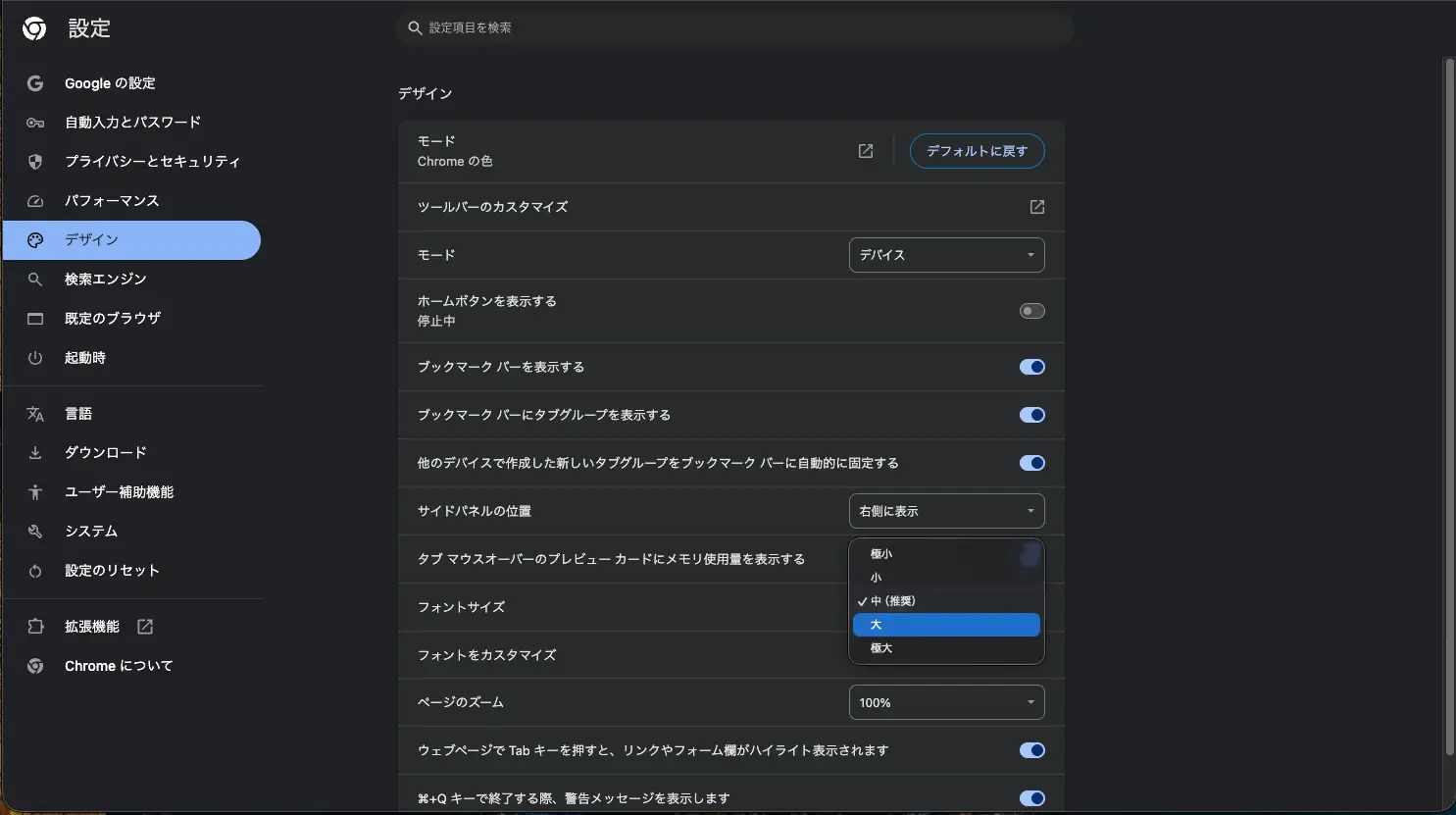 ブラウザのテキストサイズの設定について見てみましょう。Google Chrome では、設定 > デザイン > フォントサイズからテキストサイズを「極小」から「極大」の 5 段階で設定できます。
