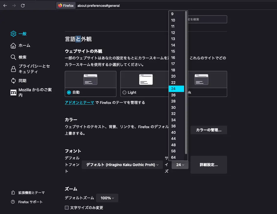 Firefox では、設定 > 一般 > 言語と外観 > フォントからピクセル単位でフォントサイズを設定できます。
