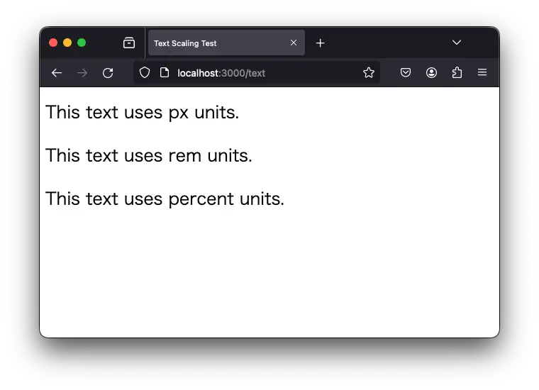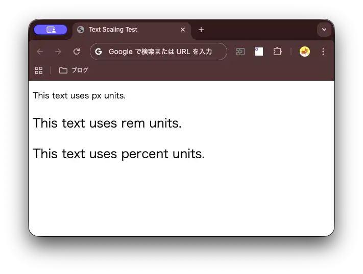 </html>Google Chrome のテキストサイズの設定を「極大」にしてみると、.px クラスのテキストは拡大されませんが、.rem と .percent クラスのテキストは拡大されることがわかります。