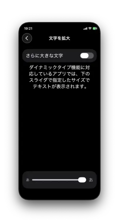 iOS では、設定 > アクセシビリティ > 画面表示とテキストサイズ > さらに大きな文字から変更できます。