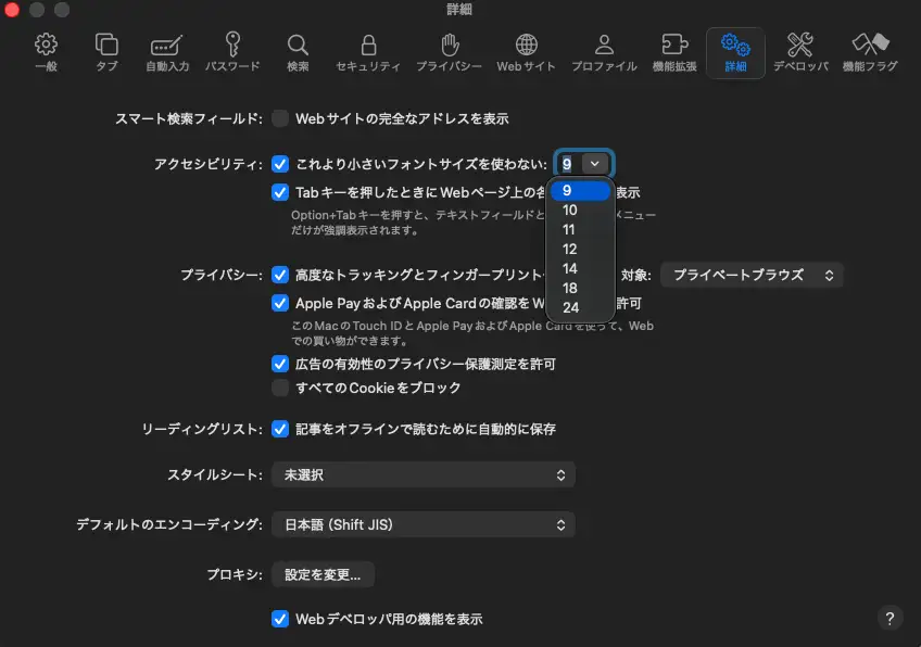 Safari では、設定 > 詳細 > アクセシビリティから最小のフォントサイズを設定できます。