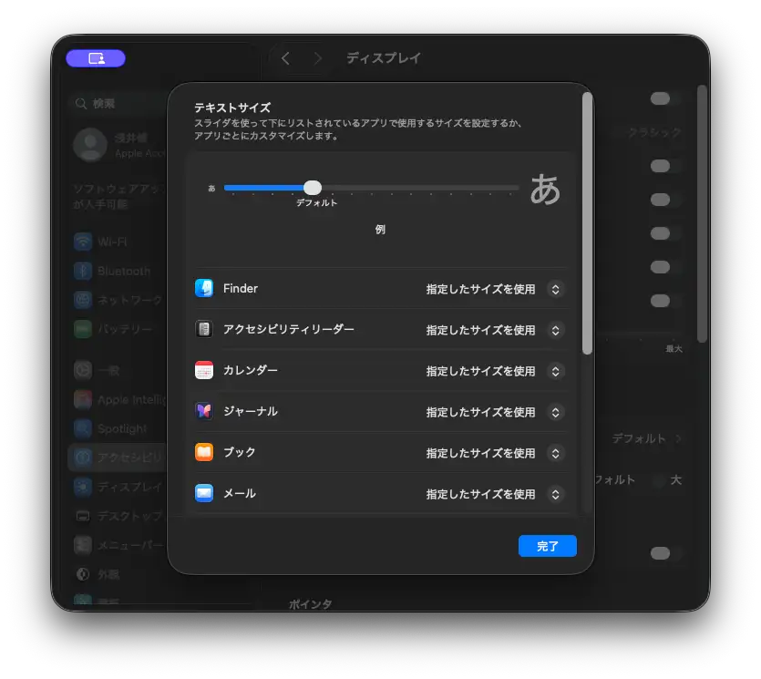 OS レベルでもテキストサイズを変更できます。macOS では、システム設定 > アクセシビリティ > ディスプレイ > テキスト > テキストサイズから変更できます。
