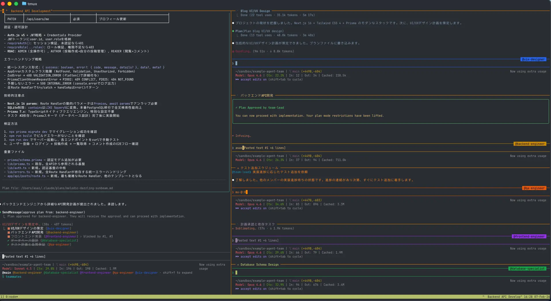 各メンバーは自分の役割に基づいてタスクを実行し、必要に応じて他のメンバーとコミュニケーションを取ってください。まずはじめに TaskCreate ツールを使用して、ブログアプリケーションを構築するために必要なタスクの一覧を作成します。このタスク一覧はすべてのチームメンバーに共有されます。タスクに依存関係があれば TaskUpdate ツールを使用して更新します。