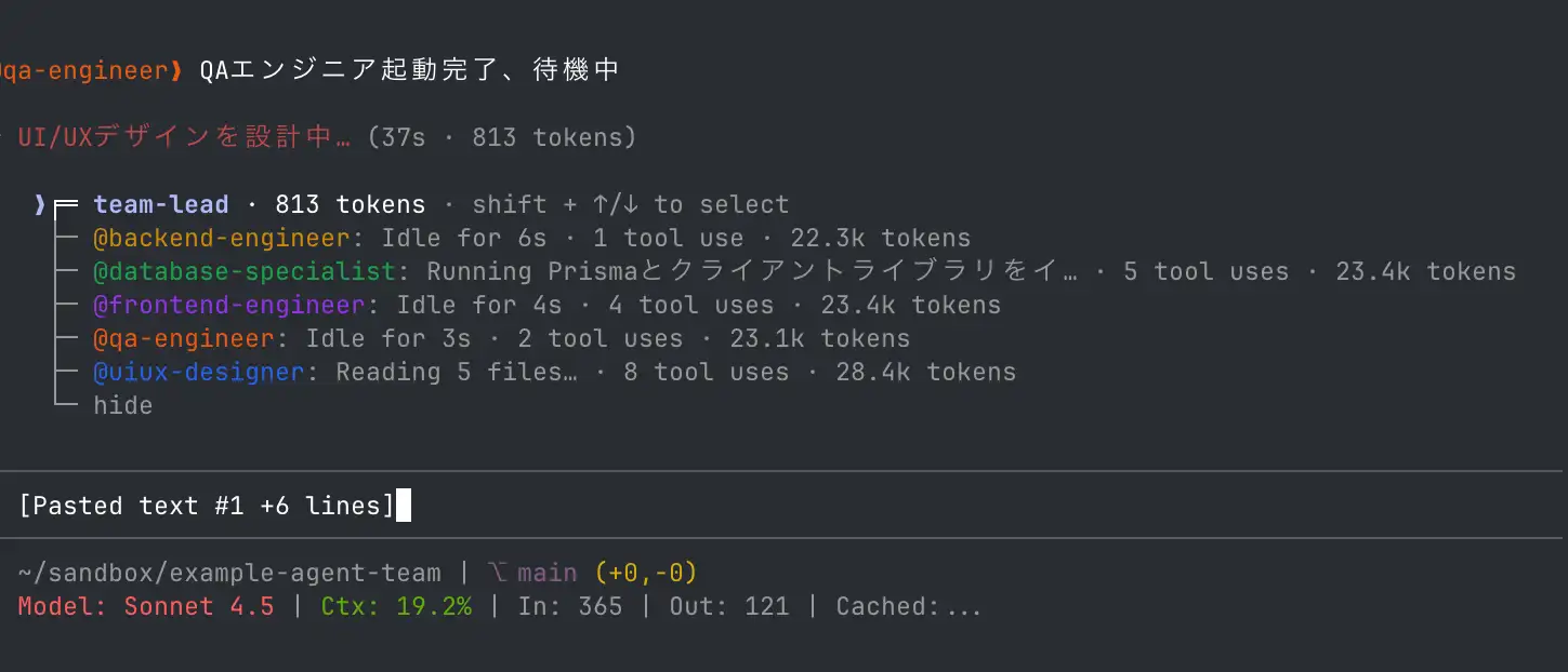 続いて TeamCreate ツールを使用してエージェントチームを作成します。ここではバックエンドエンジニアが担当するタスクはデータベーススペシャリストが担当するタスク #2 が終了した後に開始すべきことが指定されていますね。