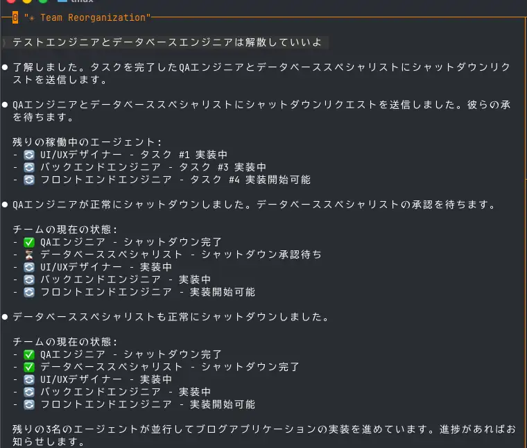 タスクが完了したら以下のプロンプトを使用してチームのシャットダウンをリクエストできます。